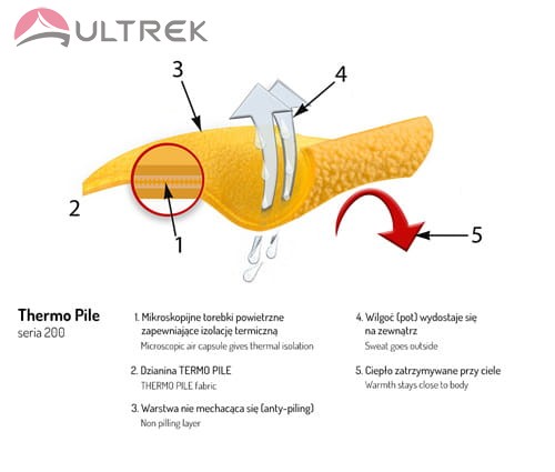 Thermo Pile 200 - To kompromis wypracowany pomiędzy ekstremalnymi walorami polaru Thermo Pile 300 i Thermo Pile 100. Produkt zapewniający ciepło i komfort noszenia przy niewielkiej wadze materiału. Jego specjalna konstrukcja zatrzymuje ciepło przy ciele i pozwala wilgoci wydostać się na zewnątrz. Jest bardzo ciepły i jednocześnie oddychający dlatego idealnie sprawdza się jako środkowa lub zewnętrzna (na cieplejsze pory roku) warstwa ocieplająca. Ubrania na długo pozostają jak nowe, jego struktura pozwala na łatwe utrzymanie w czystości.